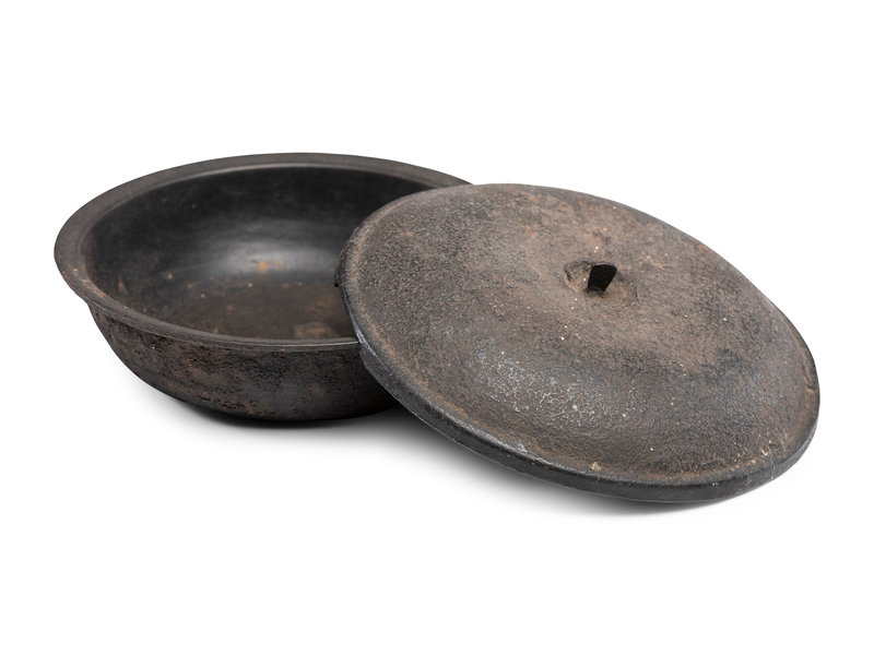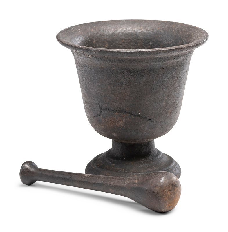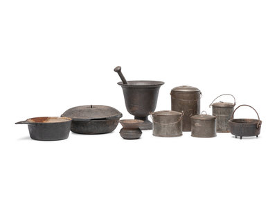 nine pieces total including five iron pots and a mortar and pestle, and four tin lidded cannisters with swing handles.