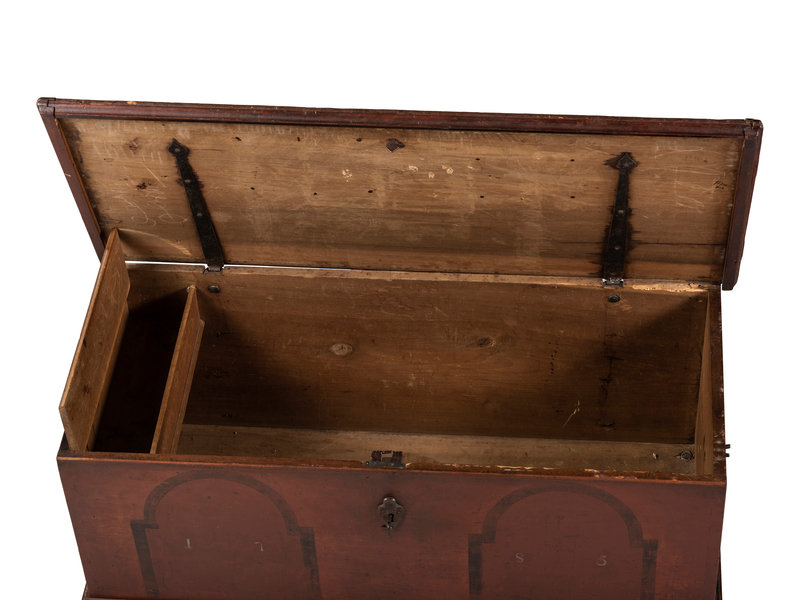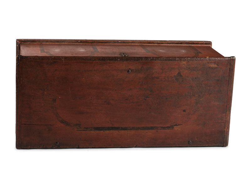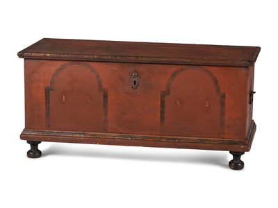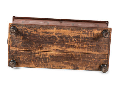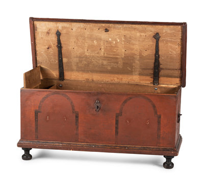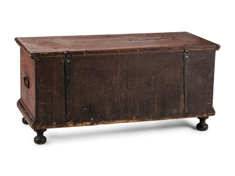 A Chippendale Red and Black Paint Decorated Wrought-Iron Mounted Poplar Blanket Chest