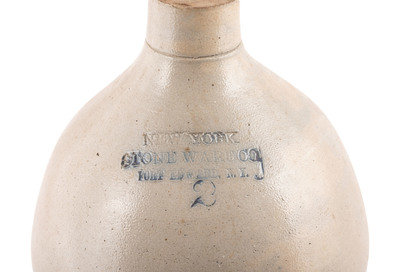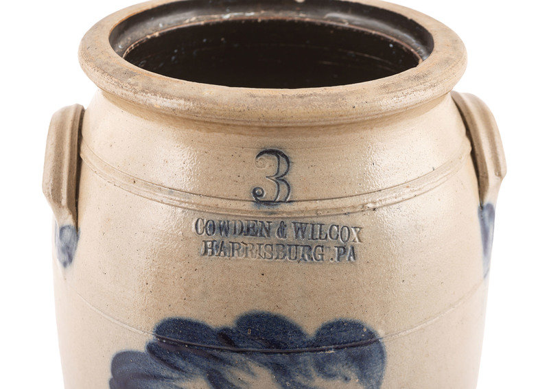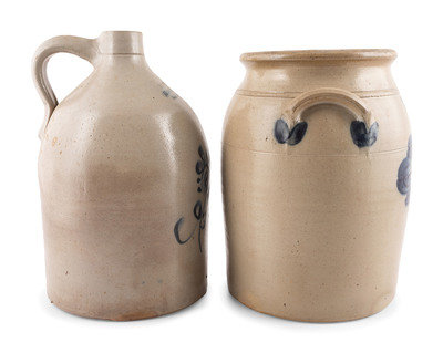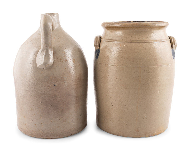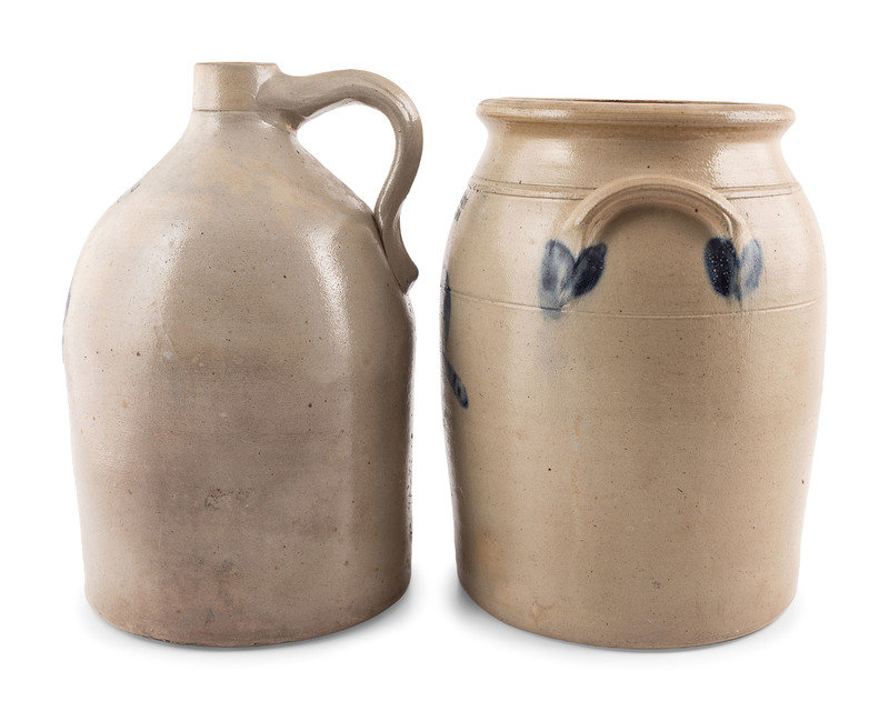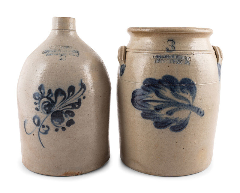 comprising a New York Stoneware Co. two-gallon jug and a Cowden & Wilcox three-gallon crock.