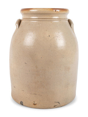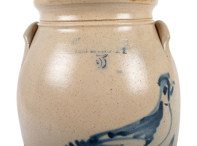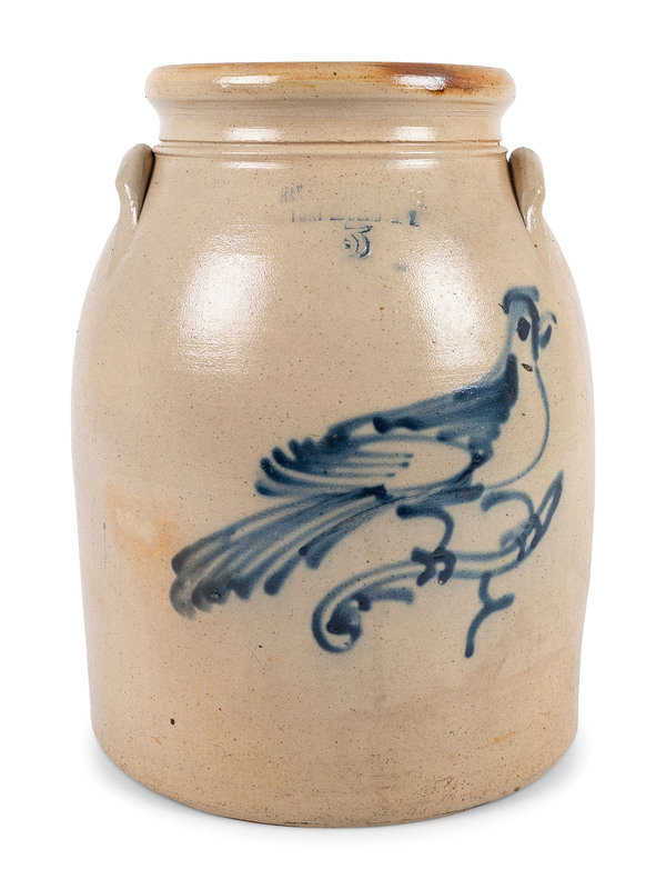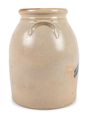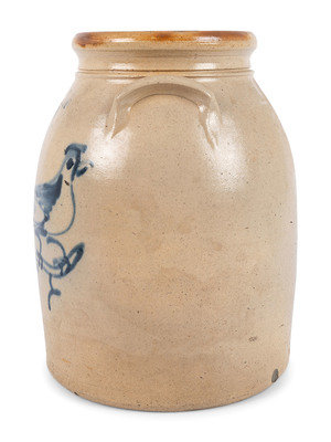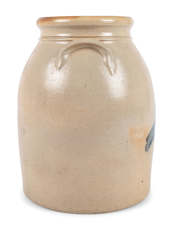 A Three-Gallon New York Stoneware Crock with Cobalt Freehand Bird