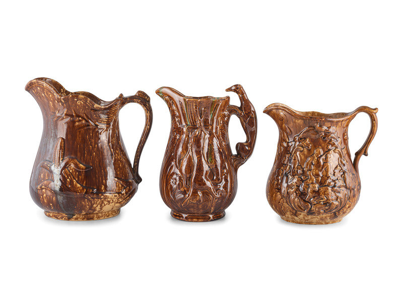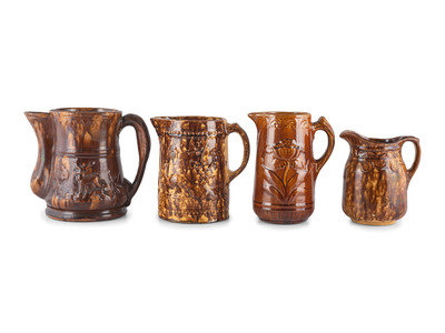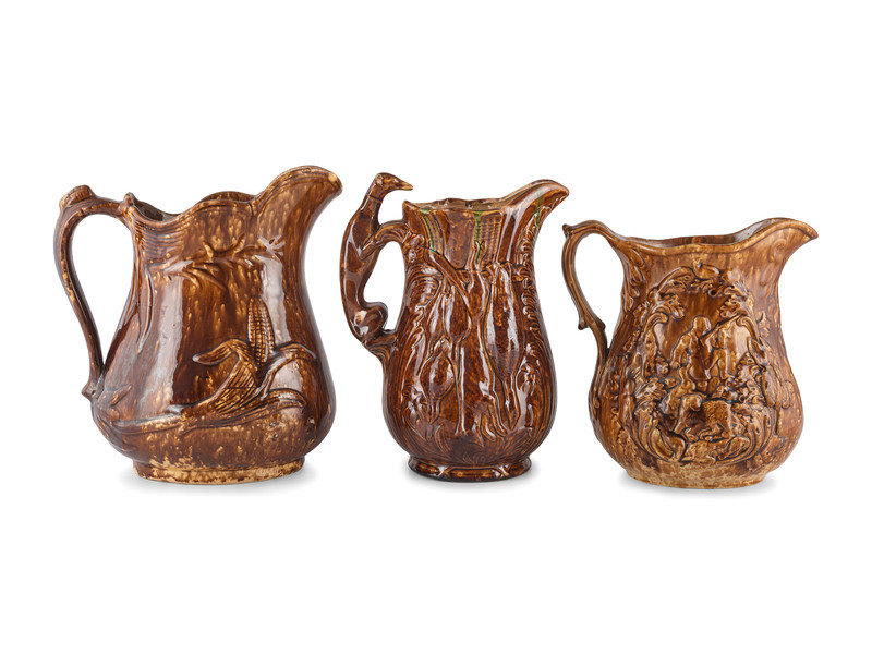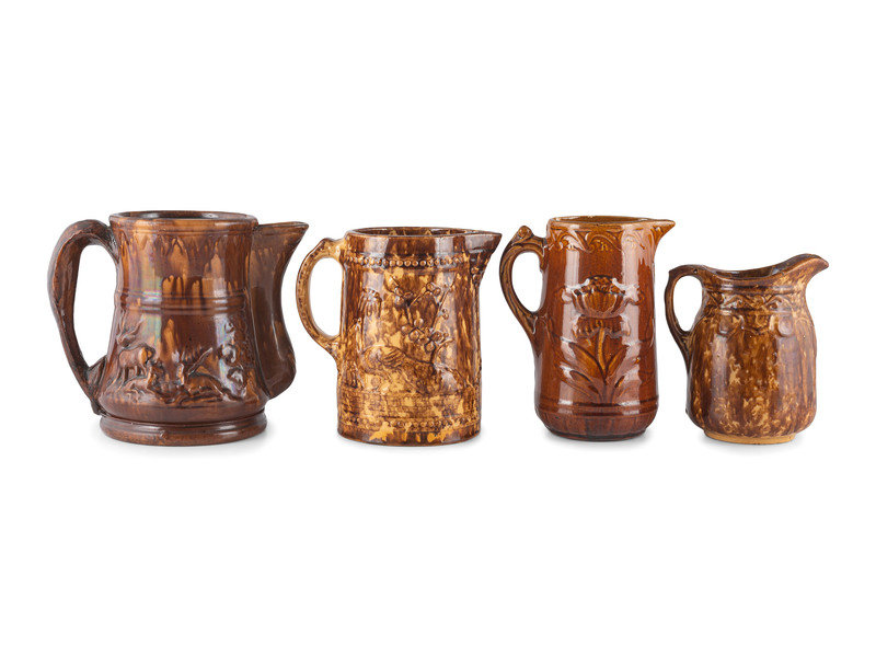 Seven Molded Yellowware Pitchers in Rockingham Glaze