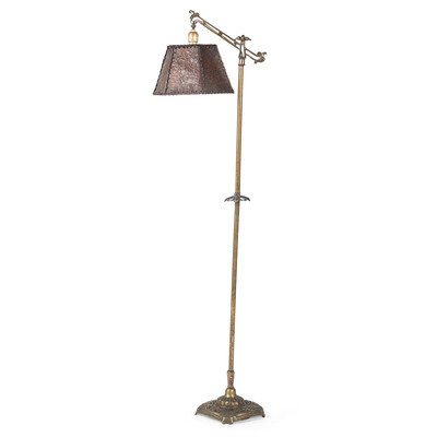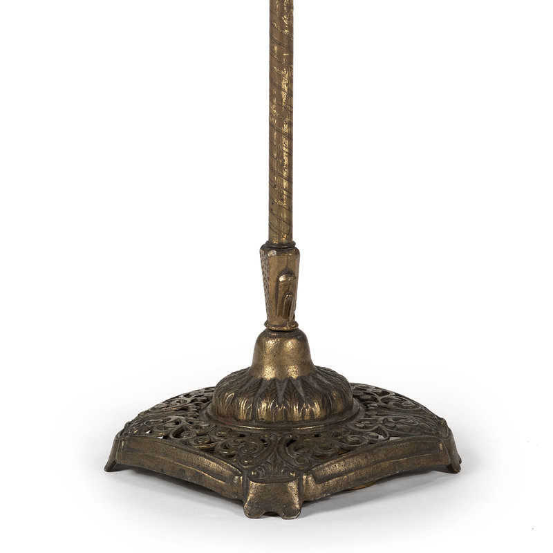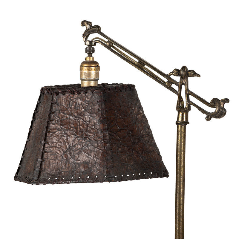 A Cast Metal Floor Lamp with a Leather Shade