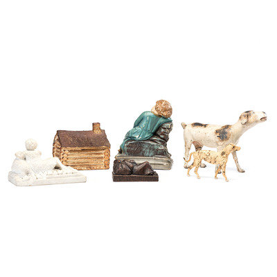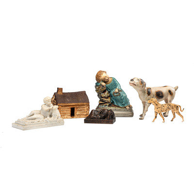 six items total including a chalkware sleeping child, a marble sculpture of a resting shepherd and lamb, a carved wooden mother and child, a log cabin and two toy dogs.