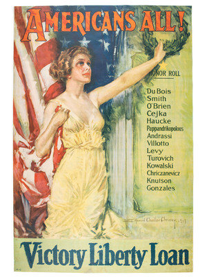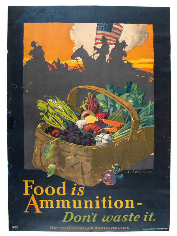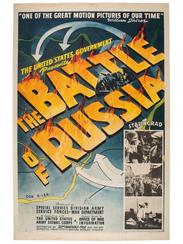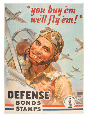 including Defense Bonds Stamps, Food is Ammunition, a 1943 The Battle of Russia movie poster, Victory Liberty Loan and Royal Dutch Air Lines.