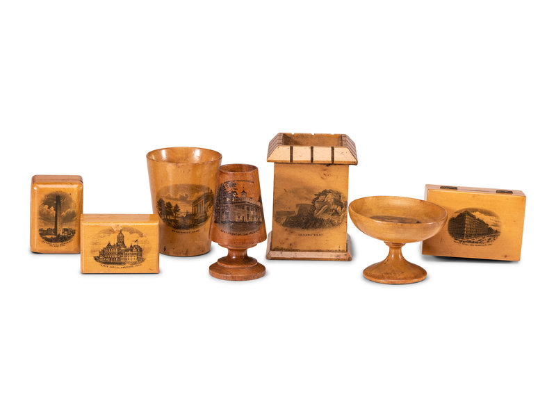includes a Washington House cup, a Sunapee Harbor ring dish, three boxes for Bunker Hill Monument, State Capital, Hartford, Conn., Palace Hotel, San Francisco, a Home of Washington toothpick holder and bank for Lover's Seat.