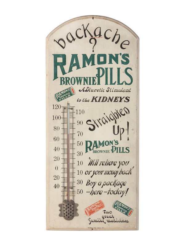 A Wood-Mounted Ramon's Brownie Pills Advertising Thermometer
