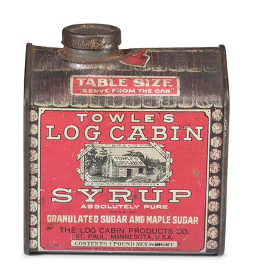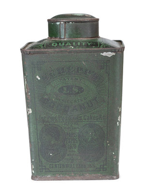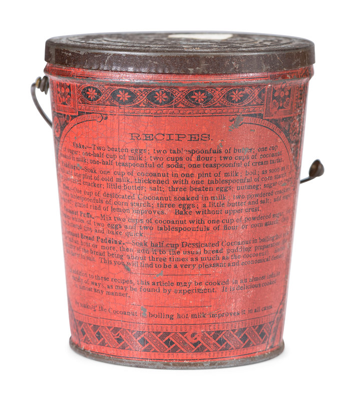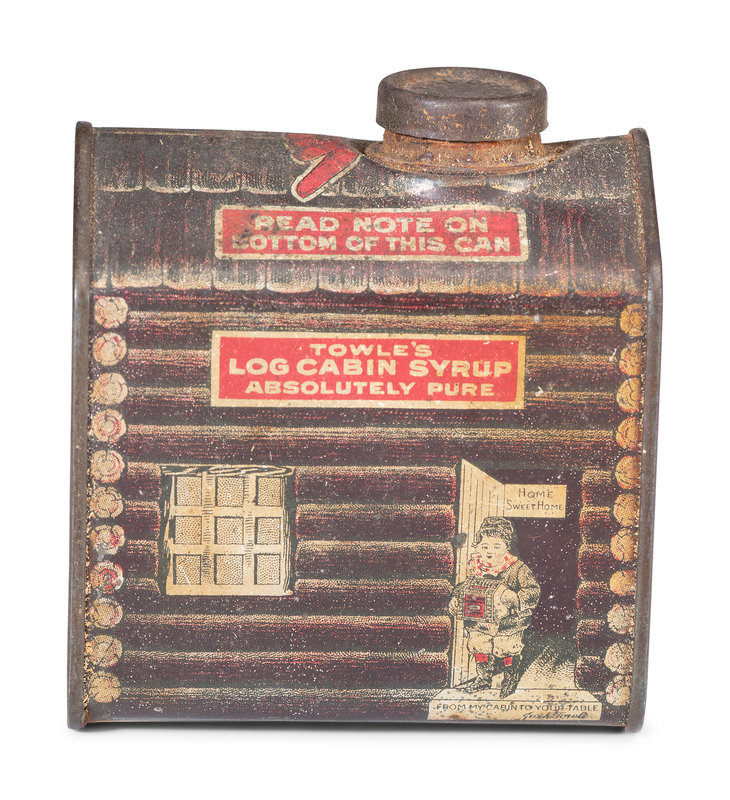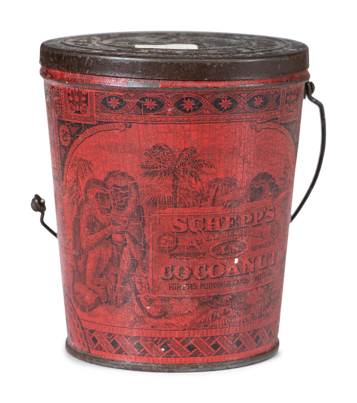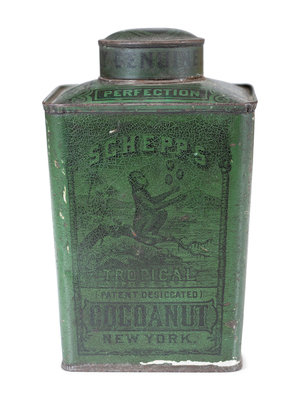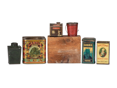 includes a wooden box for Caswell Livermore & Co. Cod Fish and tins for Towle's Syrup, Farine Banania, Baby Stuart Breakfast Cocoa, Castle Teas and two tins for Schepps Cocoanut.