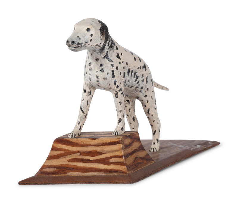 comprising a beagle, a boxer, an American Staffordshire terrier, and a Dalmatian with paperboard ears rising on a wooden base.