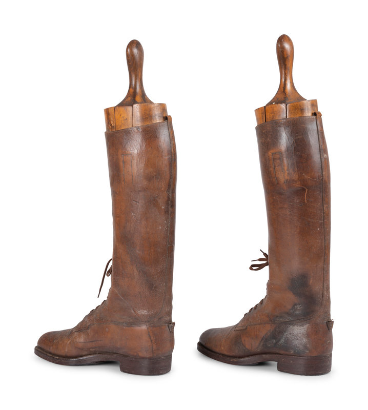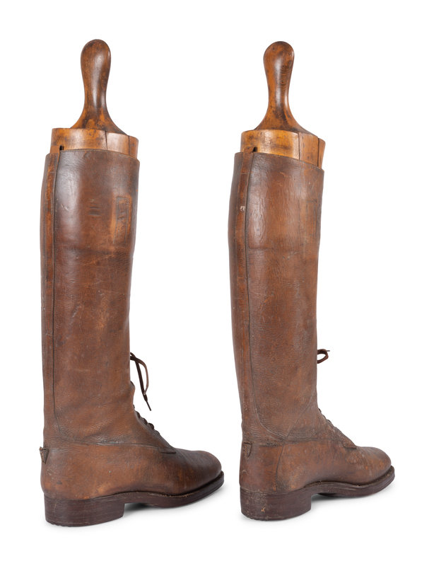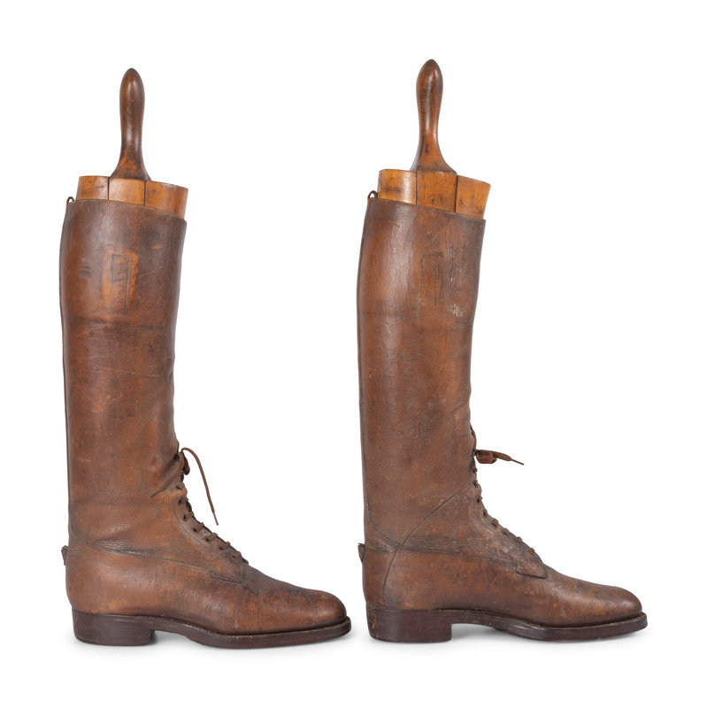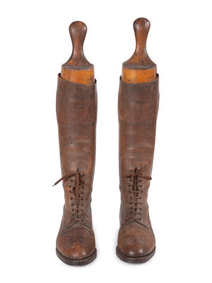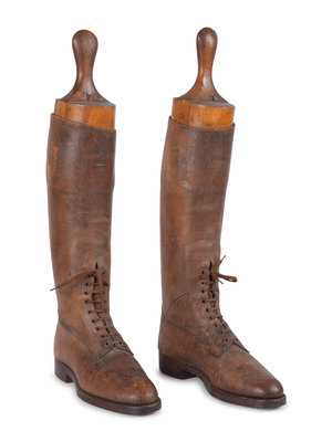 A Pair of Leather Lace Up Pull-On Men's Boots with Wood Boot Stretchers