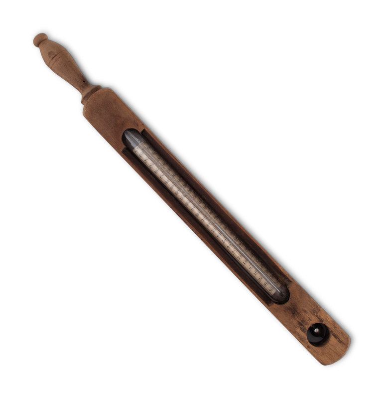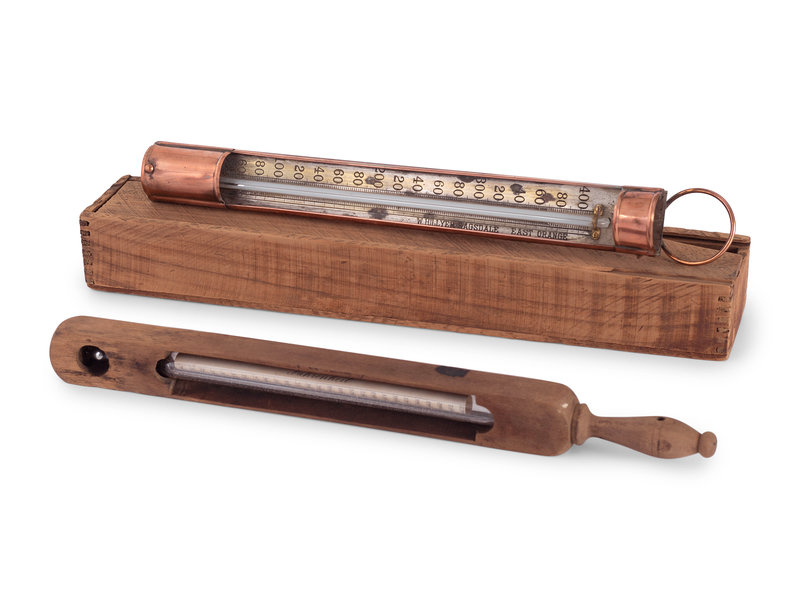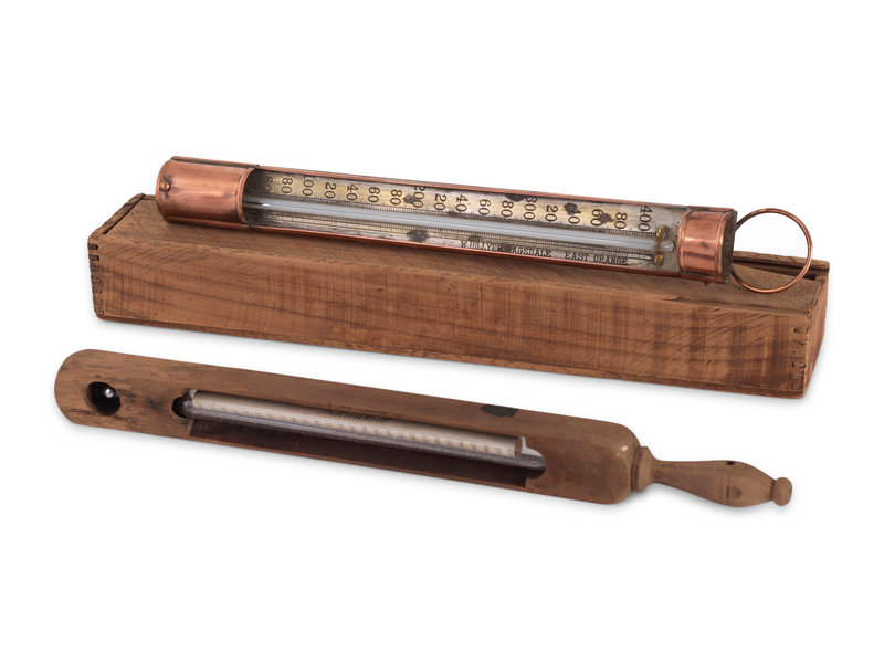 A Copper Tycos Candy Thermometer and a Wood Encased Floating Bath or Dairy Thermometer