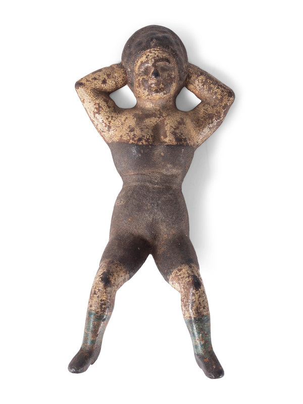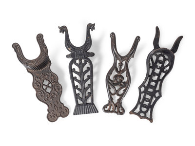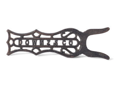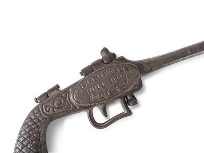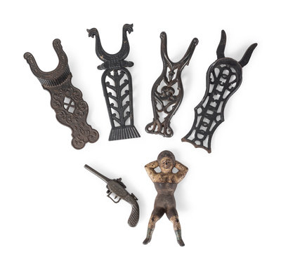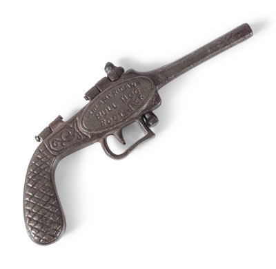including a pistol-form example inscribed The American Bull Dog Boot Jack, a figural Naughty Nellie example, an example that reads Downs & Co and three other decorative examples.