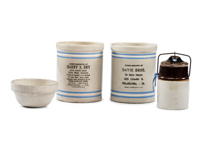 comprising two advertising crocks, a Western Stoneware Co. jar, and a bowl.