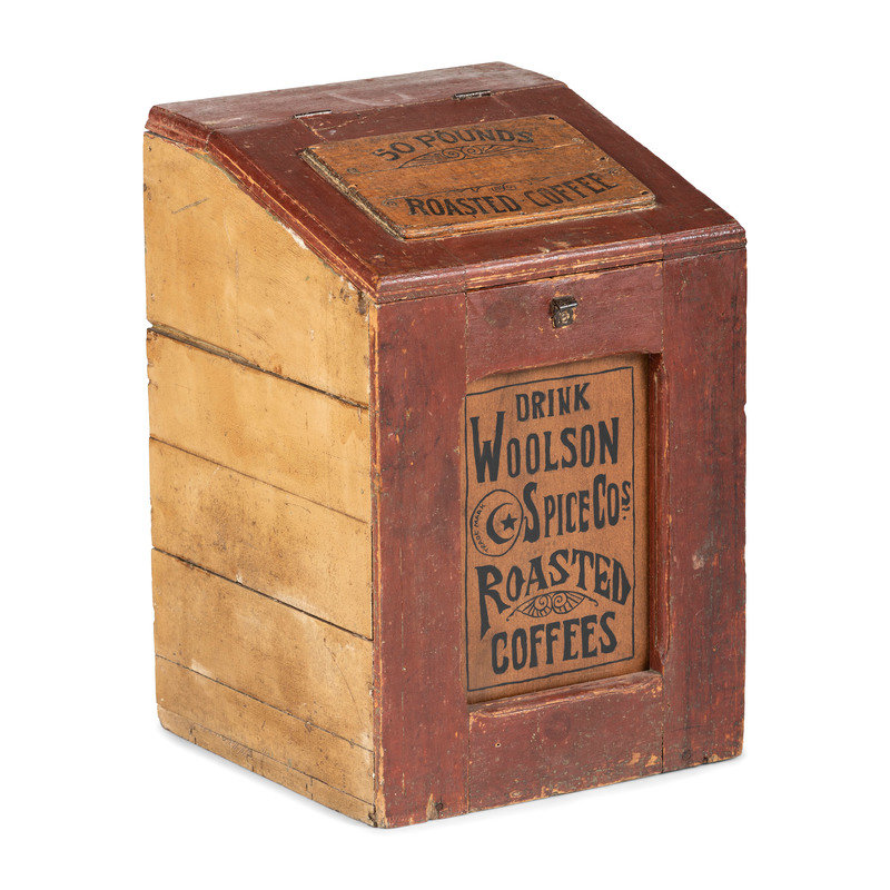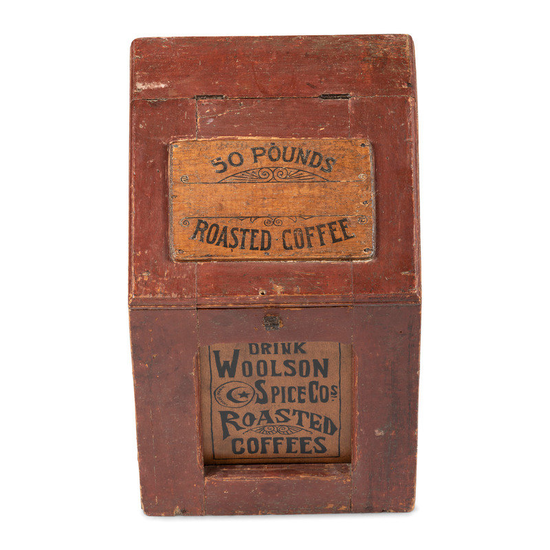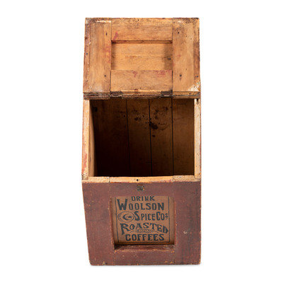 A Woolson Spice Co. Stenciled Wood Coffee Bin