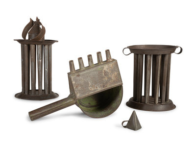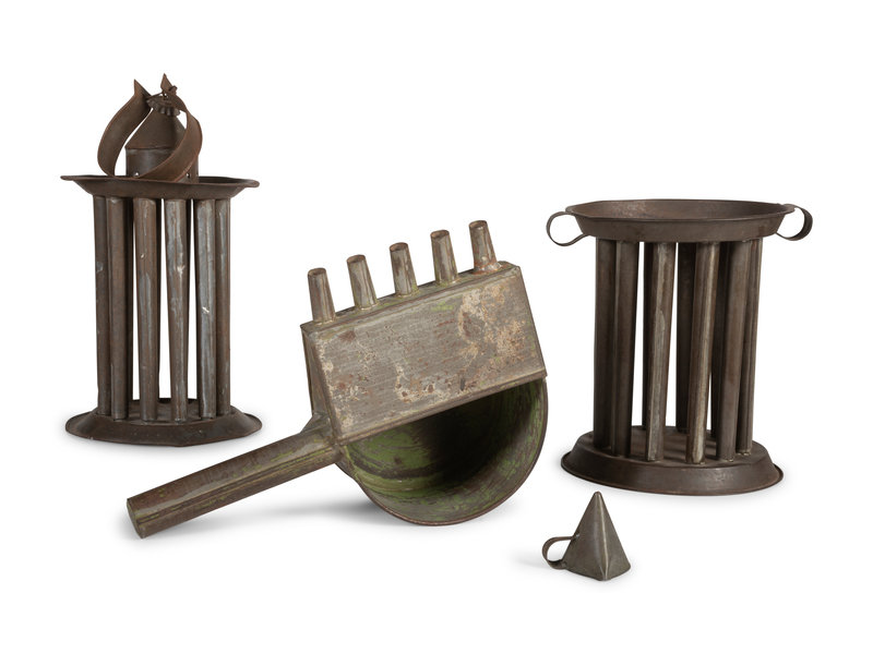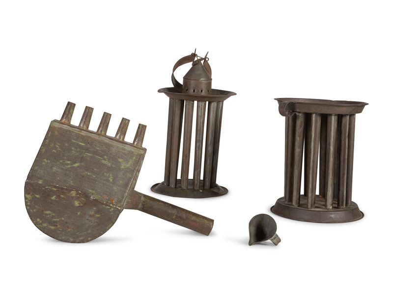 Two Tin Twelve-Hole Candle Molds, a Tin Five-Tube Wax Pourer and a Tin Candle Snuffer