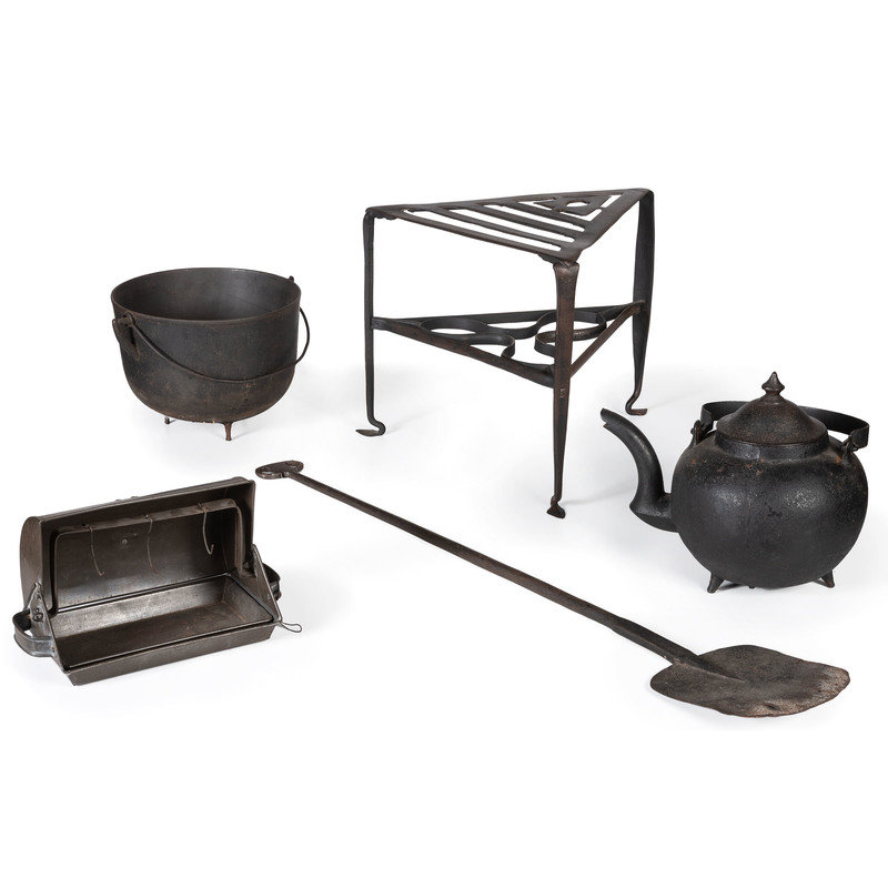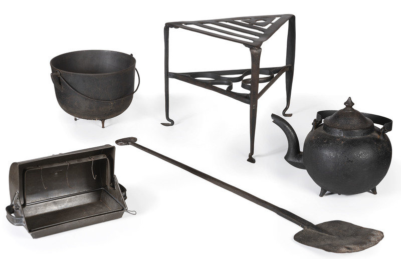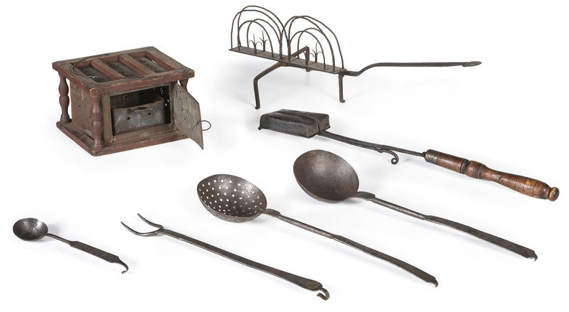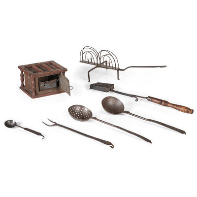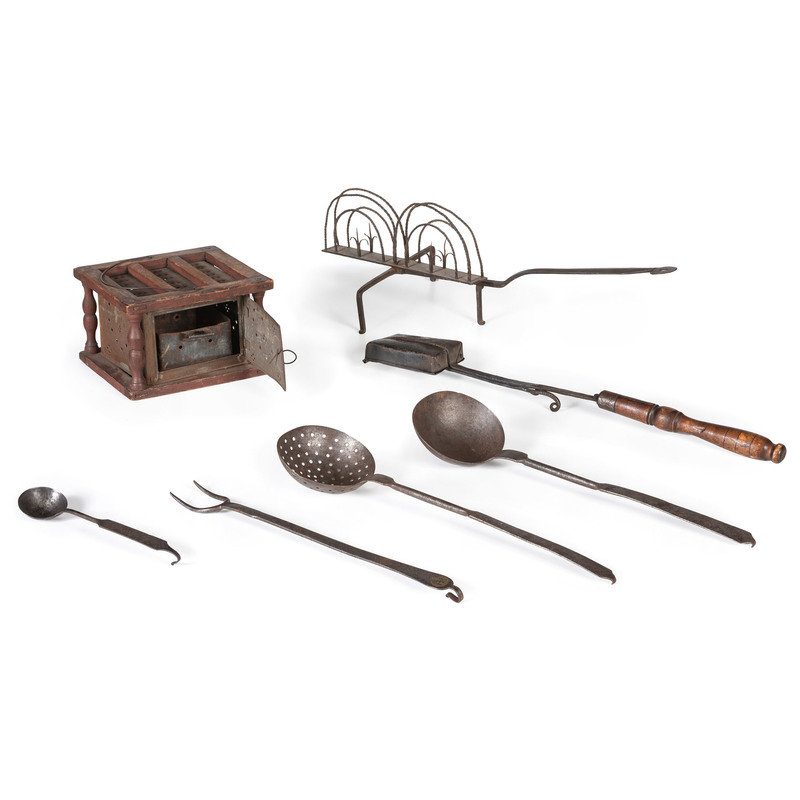 comprising a toasting rack, a lidded pot, a cauldron, a hearth stand, a ladle, a skimmer, a meat fork, a spoon, a spatula, a footwarmer, and a tin reflector fireplace roaster; 13 items total.