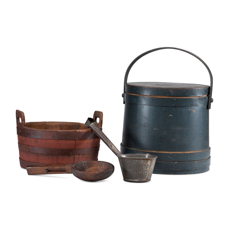 A Painted Wood Wash Tub, a Painted Stave and Bentwood Firkin, and Two Ladles