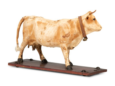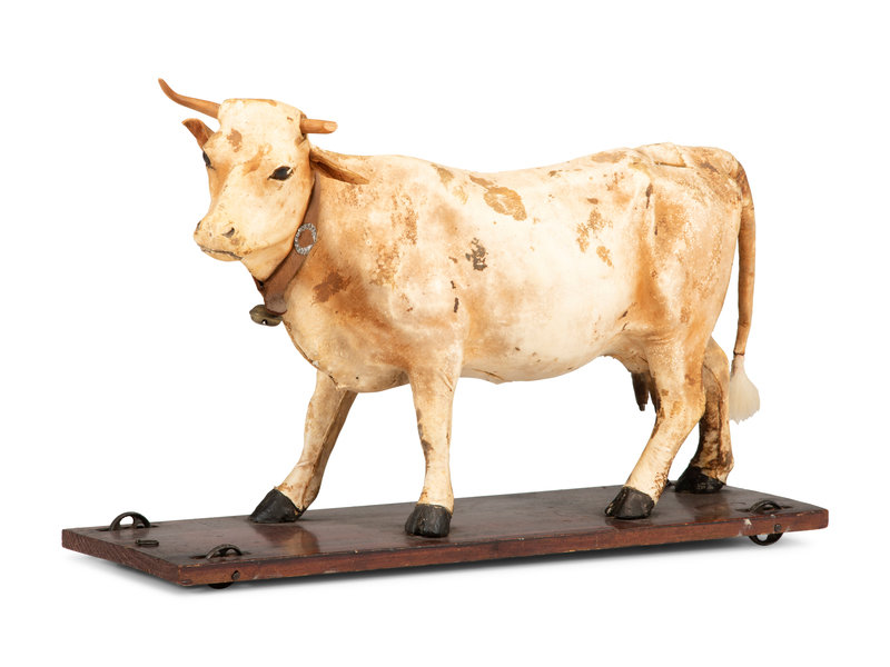 A Wood and Leather Mooing Cow-Form Pull Toy