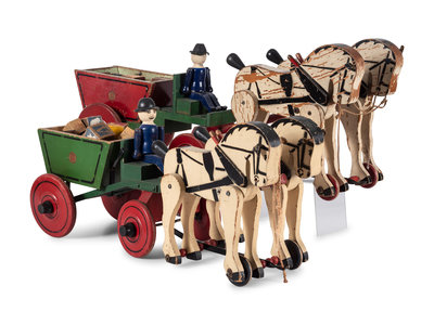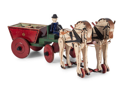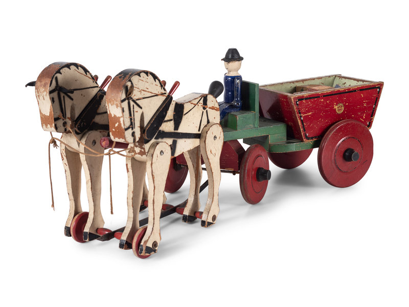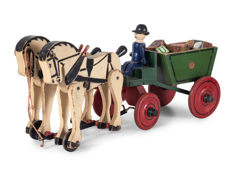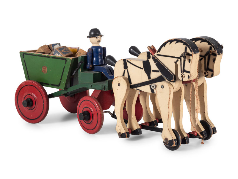 Two Carved Wood Horse-Drawn Carriages with Children's Blocks