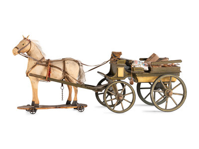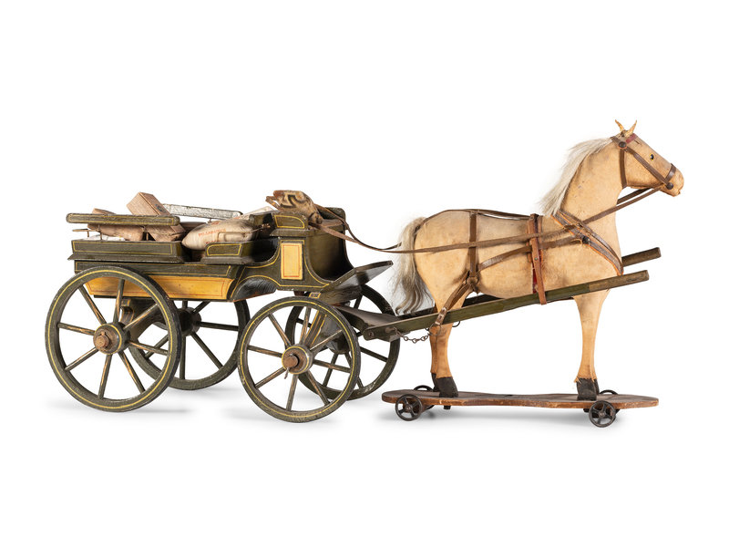 A Carved and Painted Wood Wagon with Stuffed Horse Pull Toy