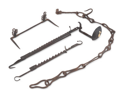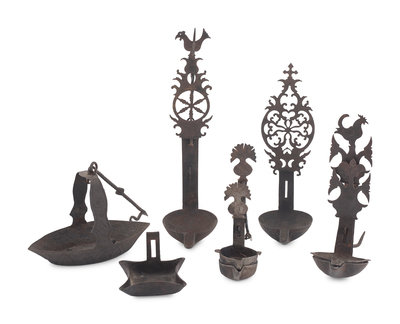 comprising three cruise lamps, three double cruise lamps, a fireplace chain, two trammels, a warming stand, two early lighting articles and a hearth hanging rail; 13 items total.