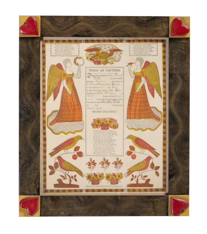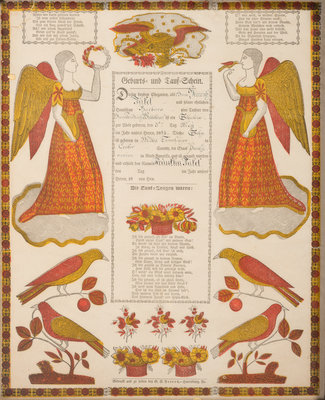 A Pennsylvania German Engraved and Polychrome Decorated Baptism Fraktur
