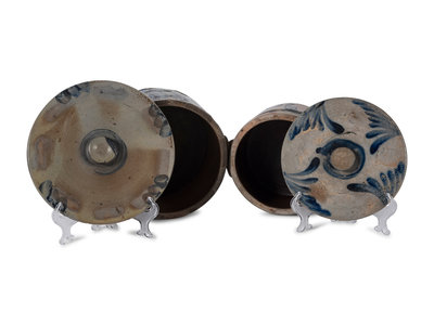 Two Cobalt Decorated Stoneware Cake Crocks