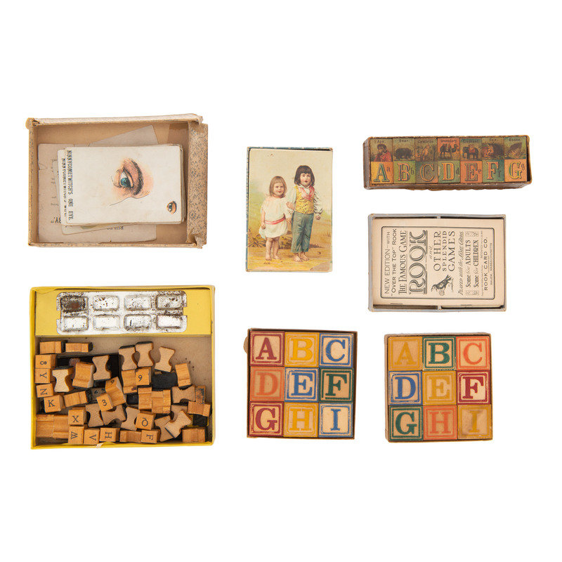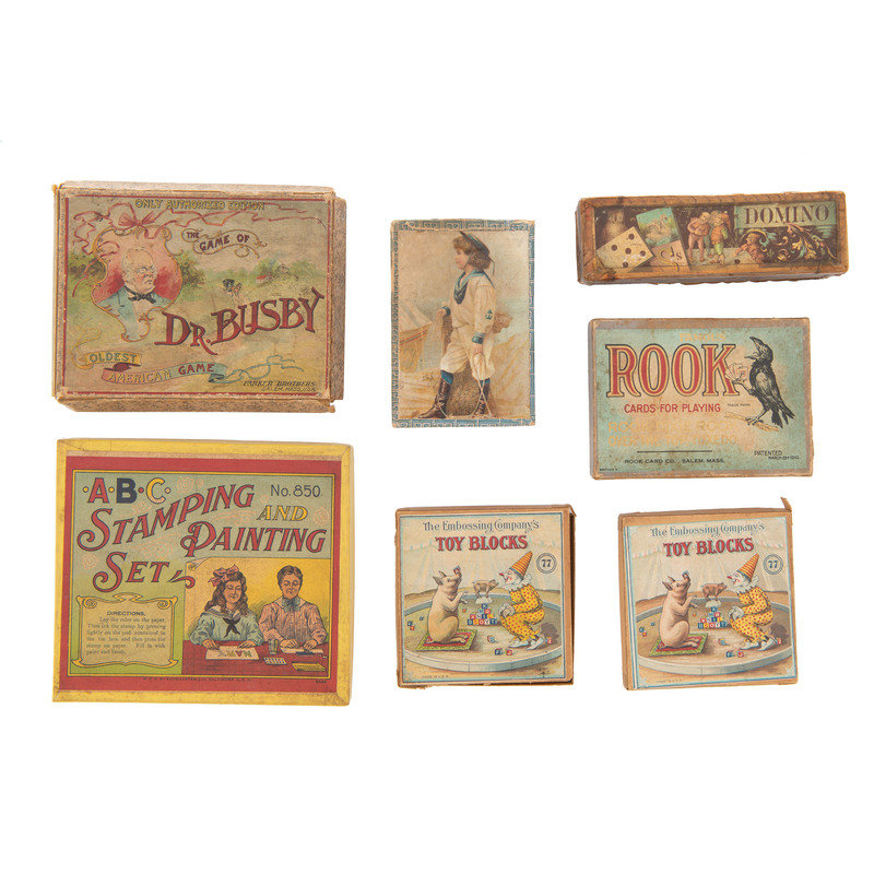 comprising an ABC Stamping and Painting Set manufactured by Baumgarten & Co., Baltimore, Maryland; The Game of Dr. Busby by Parker Brothers, Salem, Massachusetts; a deck of cards for Rook by Rook Card Co., Salem, Massachusetts, patented March 22, 1910; a box of picture cubes with image guides; two boxes of wood alphabet blocks by The Embossing Company; and a box of animal and alphabet dominoes.