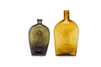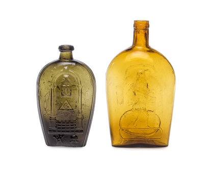 one pint size circa 1816-1830 by Keene Marlboro Street Glass Works (Keene, New Hampshire) having Masonic decorations on one side, an American eagle and raised letters HS (for Henry Schoolcraft) on the other, Height 7 3/4 inches.