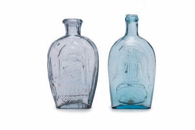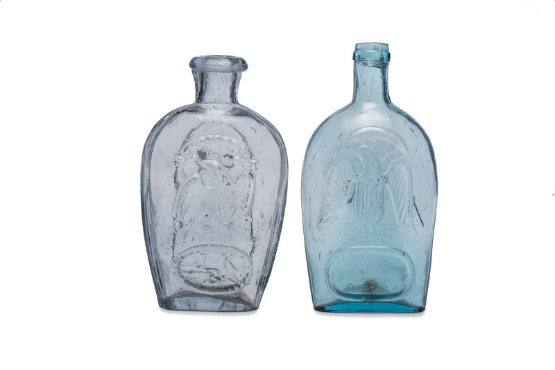 one pint size circa 1816-1830 by Keene Marlboro Street Glass Works (Keene, New Hampshire) having Masonic decorations to one side, an American eagle with raised letters J.K./B to the other, Height 7 1/2 inches.