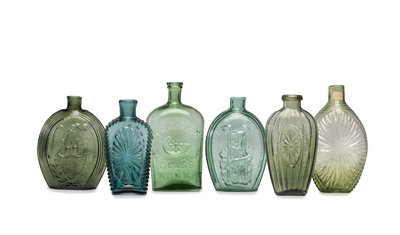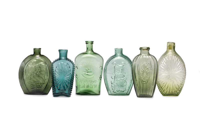 one pint size circa 1824-1840 likely by Coffin & Hay (Hammonton, New Jersey) having an American eagle with sun rays on one side, an American flag with twenty stars and the text For Our Country on the other, Height 6 1/2 inches.