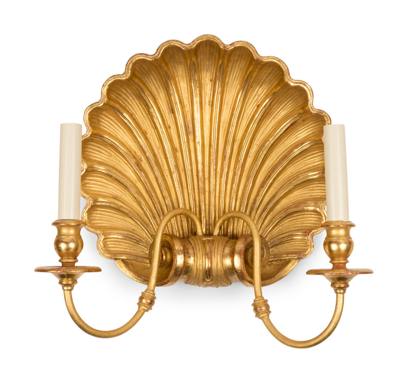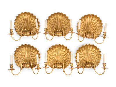 A Set of Six Giltwood Shell-Form Two-Light Sconces