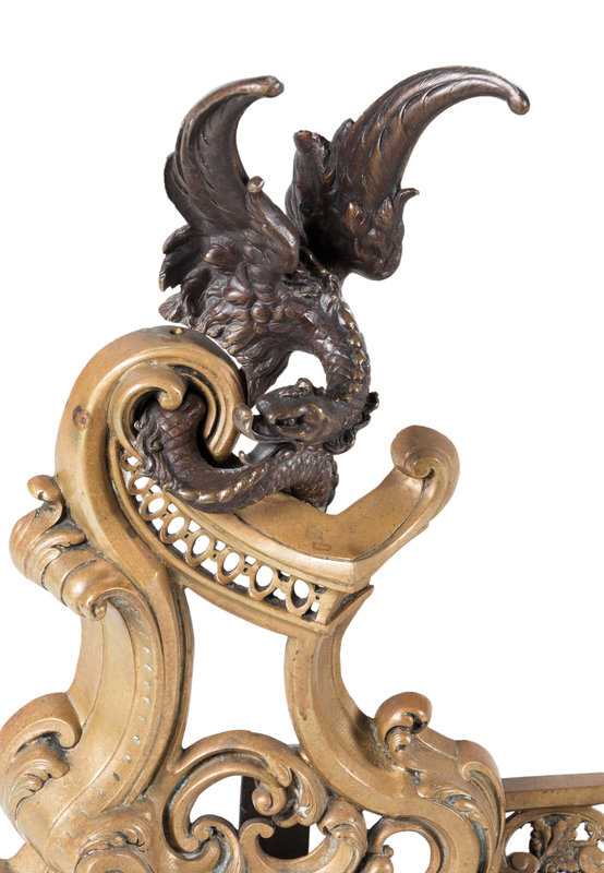 Height of chenets 16 1/2 inches; width of fender 29 inches.