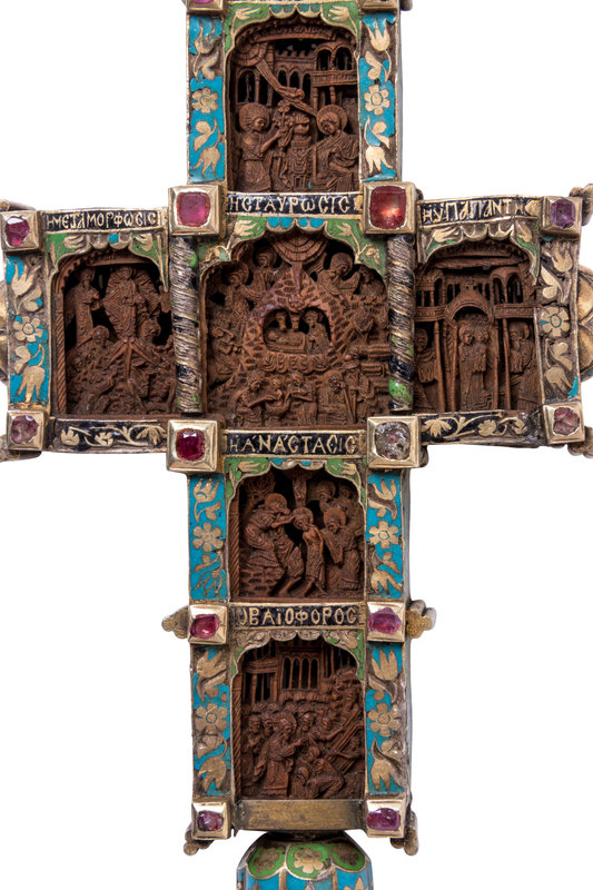 inset with twelve carved olivewood sections depicting the life of Christ; by repute, made in a monastery on Mount Athos.