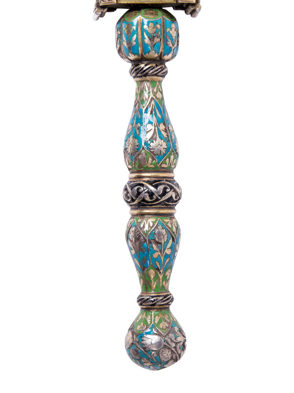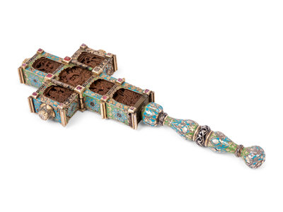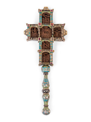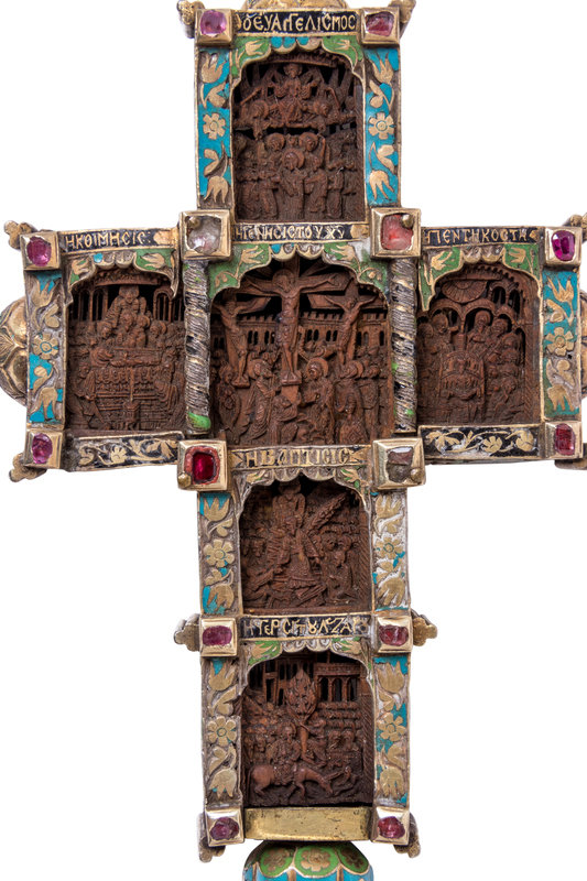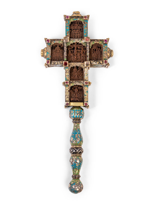 A Greek Gem-Set and Enameled Silver and Carved Olivewood Cross