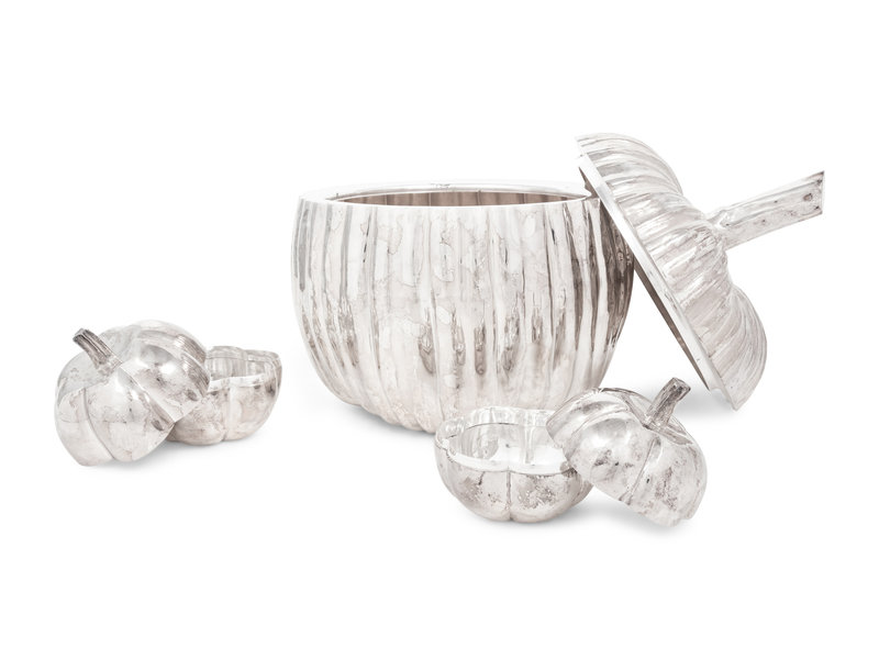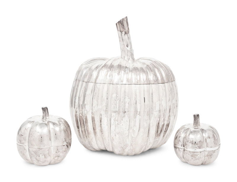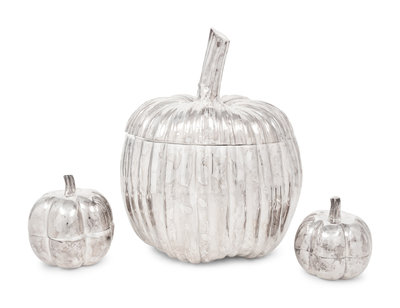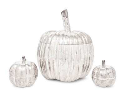 together with a pair of Mexican silver-plate pumpkin-form boxes.