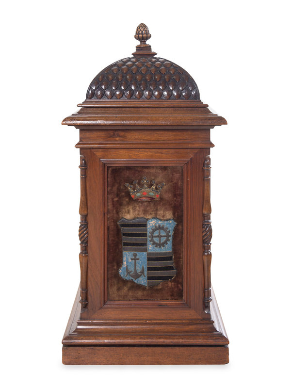 inset with a metallic thread-embroidered coat-of-arms.