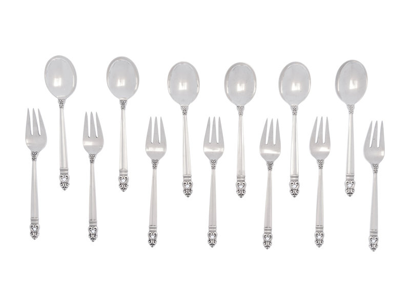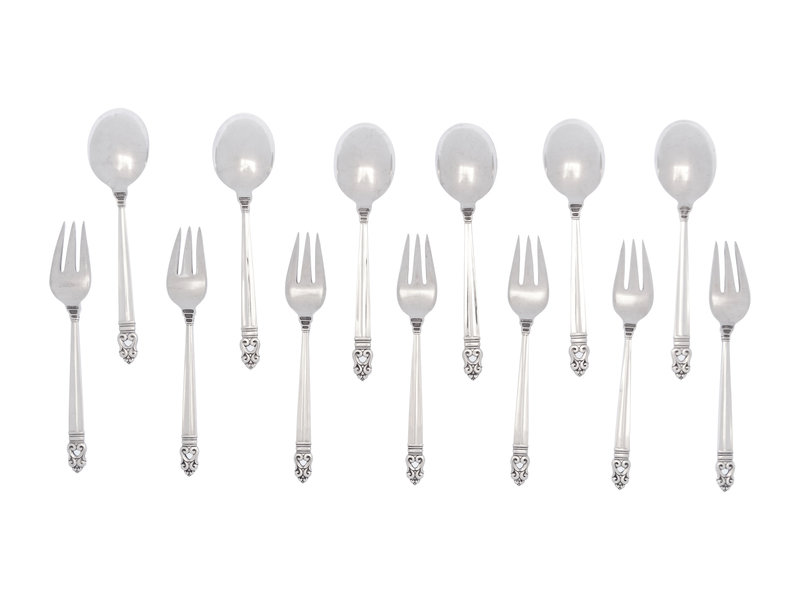 Royal Danish pattern, comprising 6 soup spoons and 7 salad forks; 13 items total.