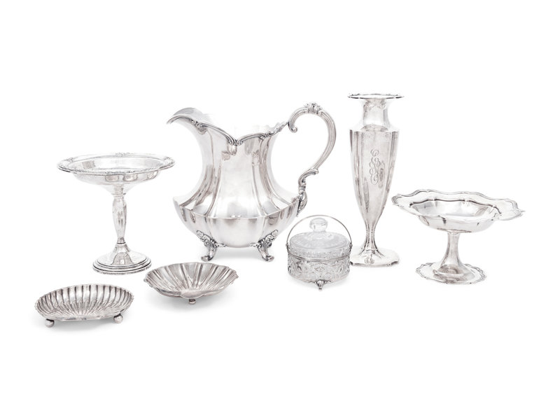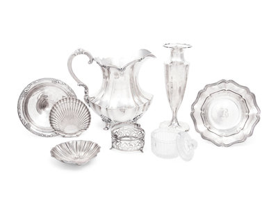 comprising an Heirloom Damask Rose weighted compote, another compote, two shell-form trays, a vase and a silver basket marked H.C. Wisner Co. fitted with an associated glass mustard jar, together with a Reed & Barton Victorian silver-plate water pitcher.