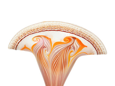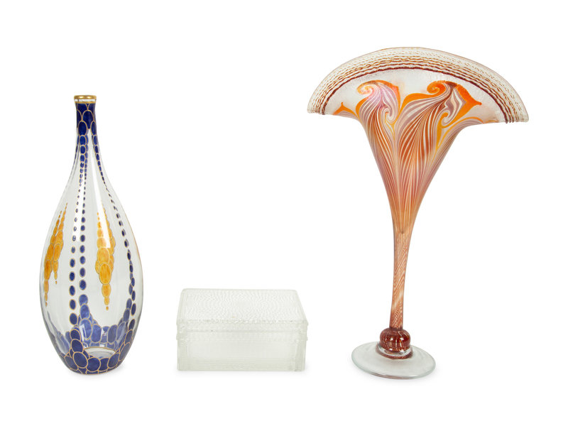 comprising a Lalique covered box, a Vandermark iridescent vase and an art glass vase signed illegibly on base.