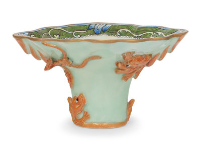 comprising three blanc-de-chine examples: each molded as if nestled within an open nest of roots that grow in relief to flowering branches, of which one is fitted with a loop handle mounted to a scalloped brass band about the mouth rim. The other a polychrome enameled example with coral and gilt decorated goldfish worked in relief, the interior mouth ring decorated with green ground scrollwork.