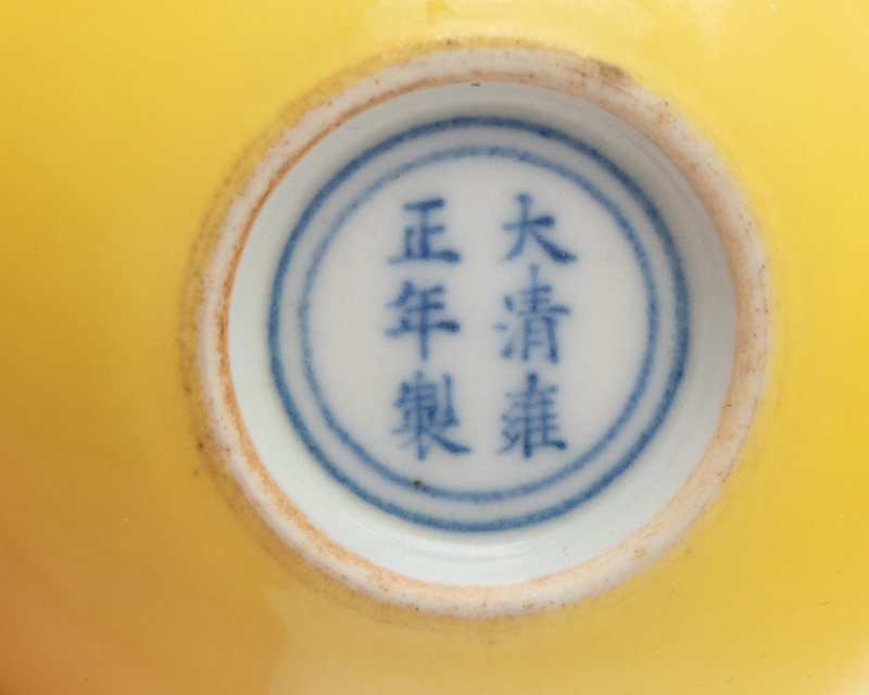the delicately potted thin walls rising with a gentle sloped, the exterior covered in an even lemon yellow, incised to the recessed base with a double ring encircling the six-character mark in underglaze blue.