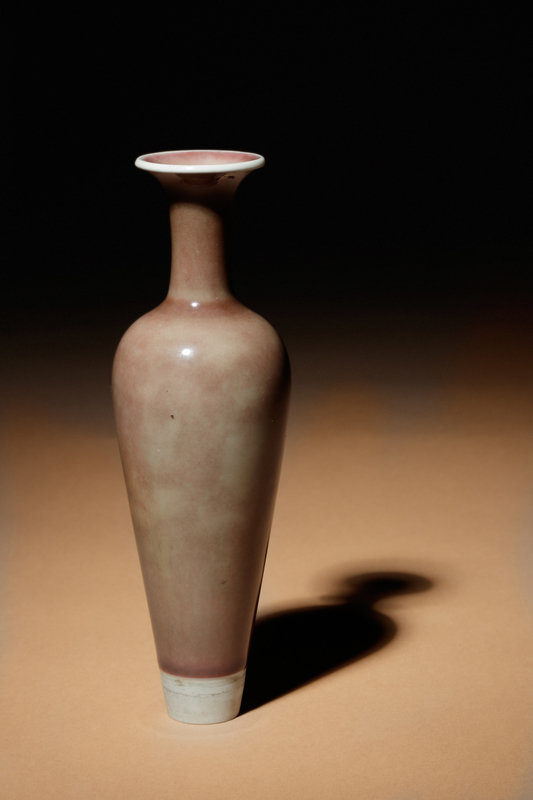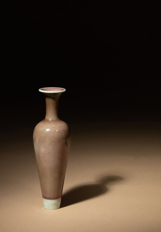 the slender body rising to rounded shoulders supporting a trumpet neck, save the mouth ring, all suffused in burnished plum glaze thinning in patches to mushroom tones before settling in a concentrated ring above the foot; the underside incised with a six-character Kangxi mark in underglaze blue; all raised above a conforming carved hardwood stand.