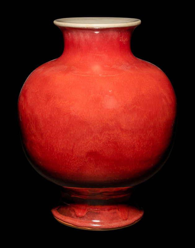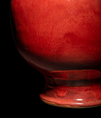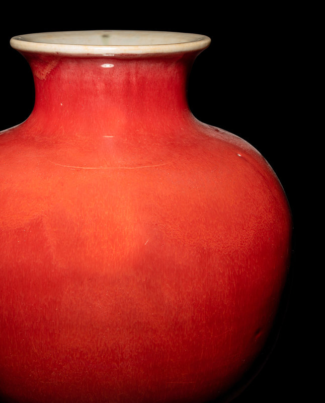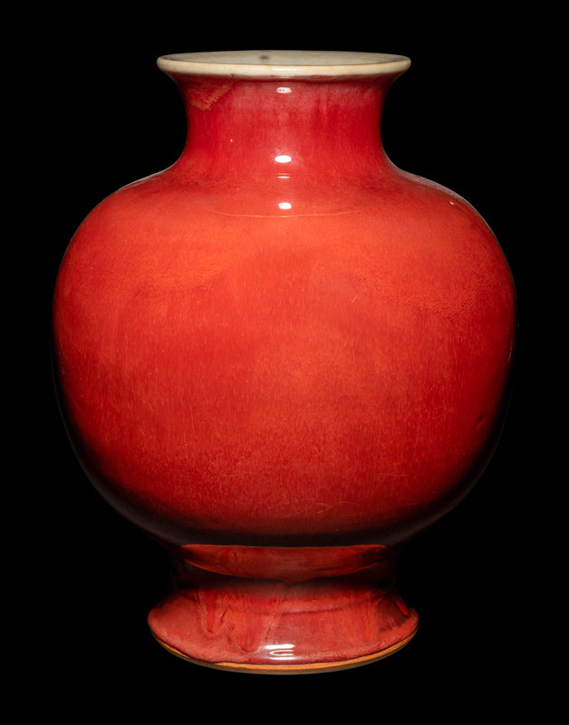 the apple-shaped body tapering towards the waisted foot and neck, covered with a glaze of rich strawberry-red tone rising up to the slightly flaring neck and thinning to a pale ivory tone at the mouth rim.