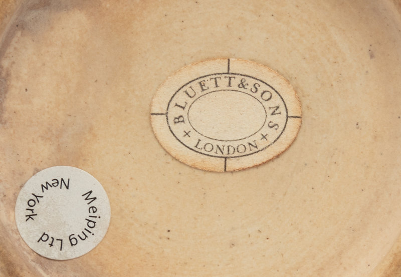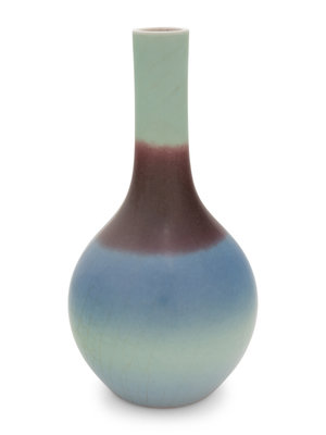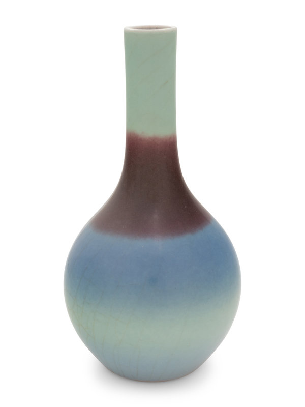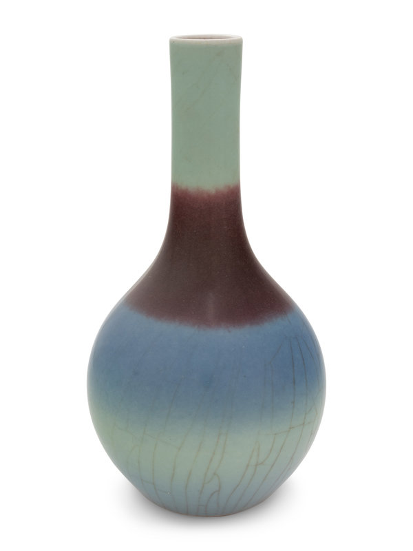the long straight cylindrical neck widening a sloping shoulders to an attractive rotund body, slightly recessed at the base. The exterior glazes in wide horizontal bands of pale blue and crushed red between soft celadon, with crackling tributaries rising from the base.