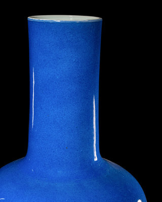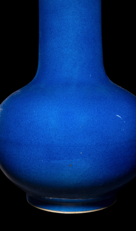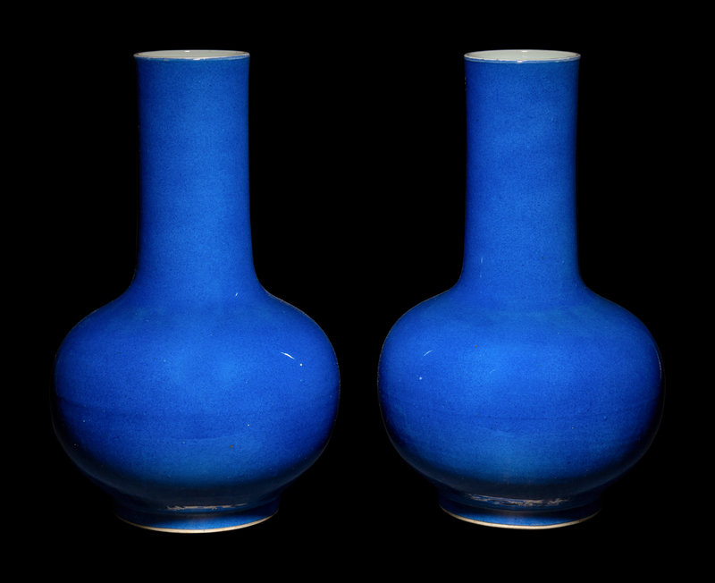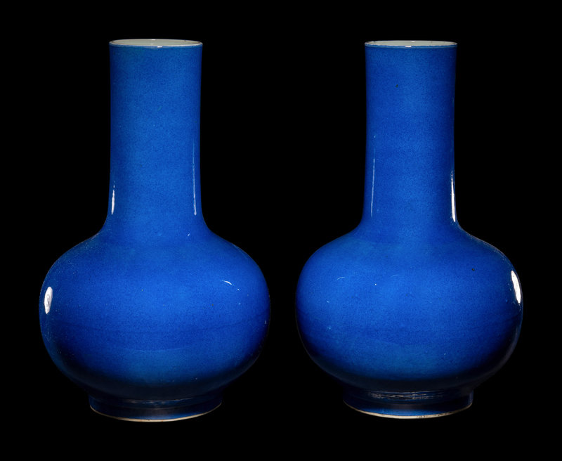 each having a wide slightly tapered foot supporting a low-set globular apple-form body, rising with angular shoulders to prominent long cylindrical neck. Each covered in a slightly dappled glaze of deep blue, thinning at the mouth and foot to reveal the pale body.