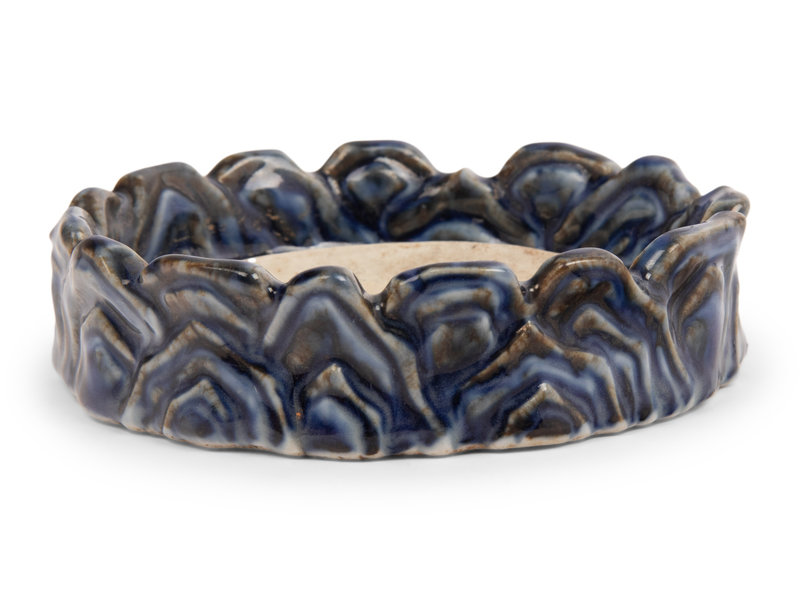 of circular section, rendered with laminated layers of underglazed craggy rockery rising to surround the unglazed shallow basin rising from a moat-like ring.