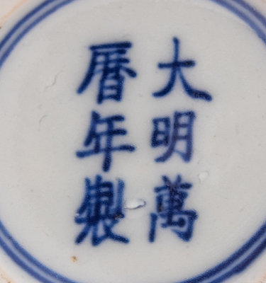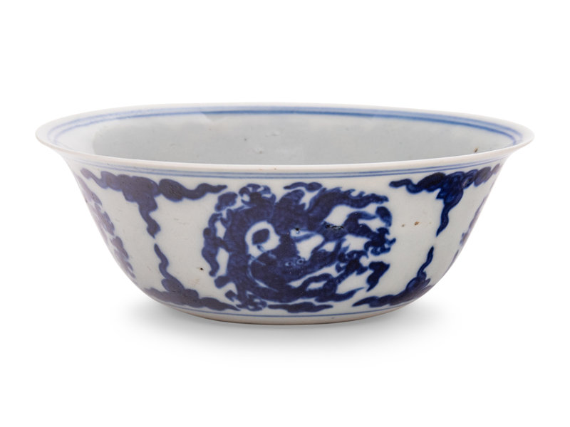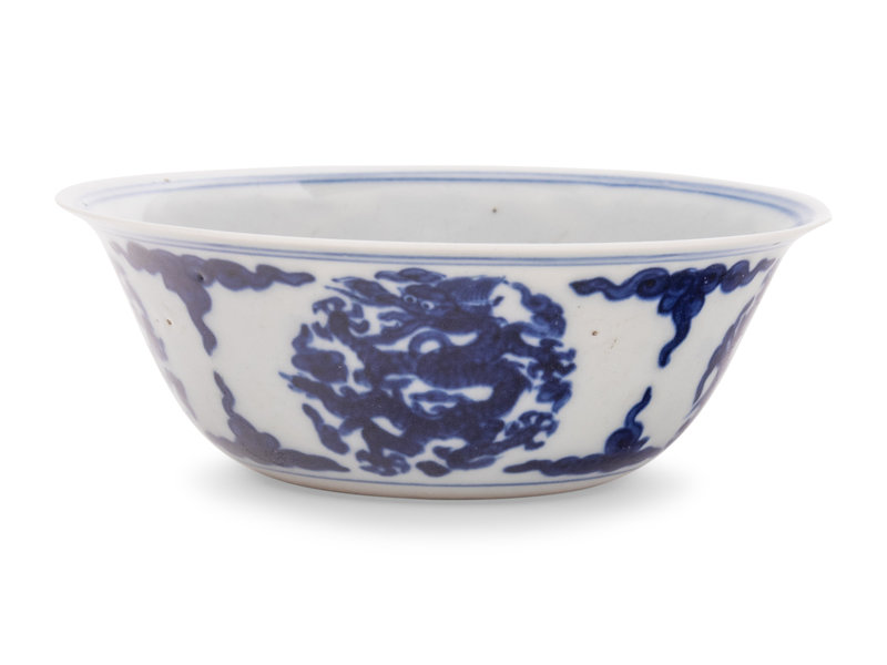 having deep walls rising to a slightly flaring mouth rim, the base slightly recessed. Painted to the exterior with four roundels of dragons circling in pursuit of a flaming pearl, divided between borders of detached cloud wisps. The interior base decorated with a fifth round encircled by two rings, and underside incised with a six-character mark within a double ring.