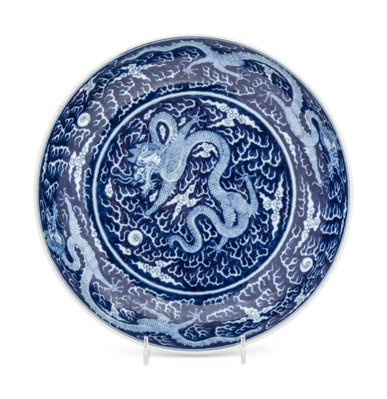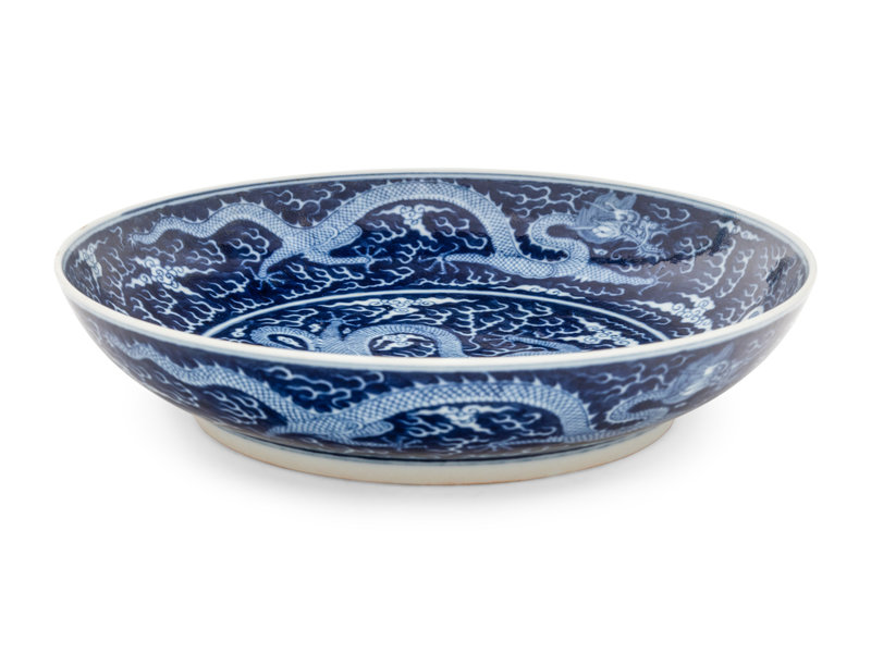 having a wide basin set above a short foot, the shallow walls following a smooth cavetto to a slighty upturn. The interior richly decorated with a central five-clawed dragon leaping amidst clouds and flames in pursuit of a flaming pearl, encircled by to further dragons along the interior walls, the exterior similarly worked.
