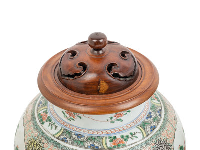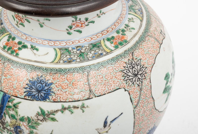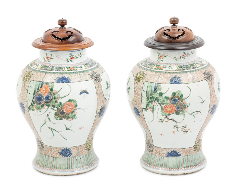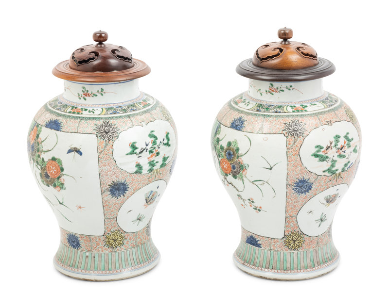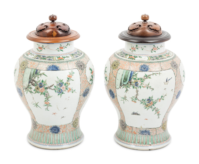 each having broad barrellike shoulders beneath a straight neck, the bodies narrowing at a low waist before a slightly spreading foot. Each reserved against a ground of puffy trifoliate clouds interspersed with radiant flowerheads with two primary rectangular panels alternating between fruit-form reserves painted with flowering branches, birds, and butterflies, all surmounted by hardwood covered reticulated with ruyi-outline.