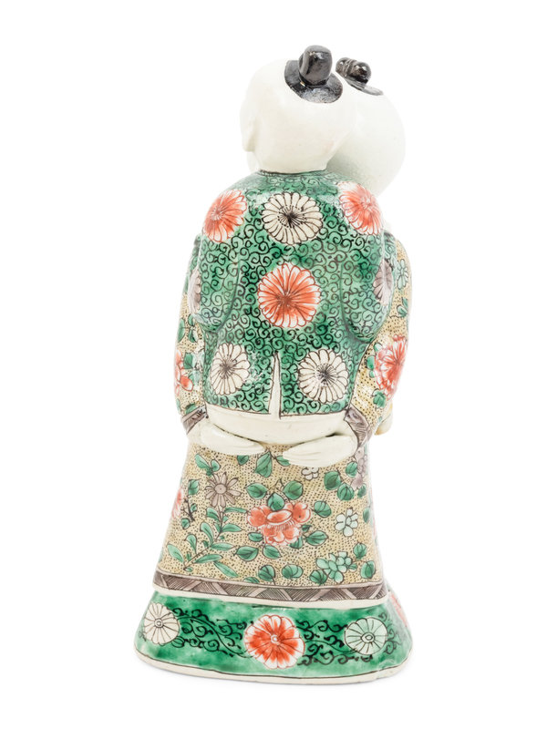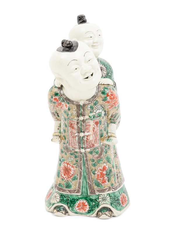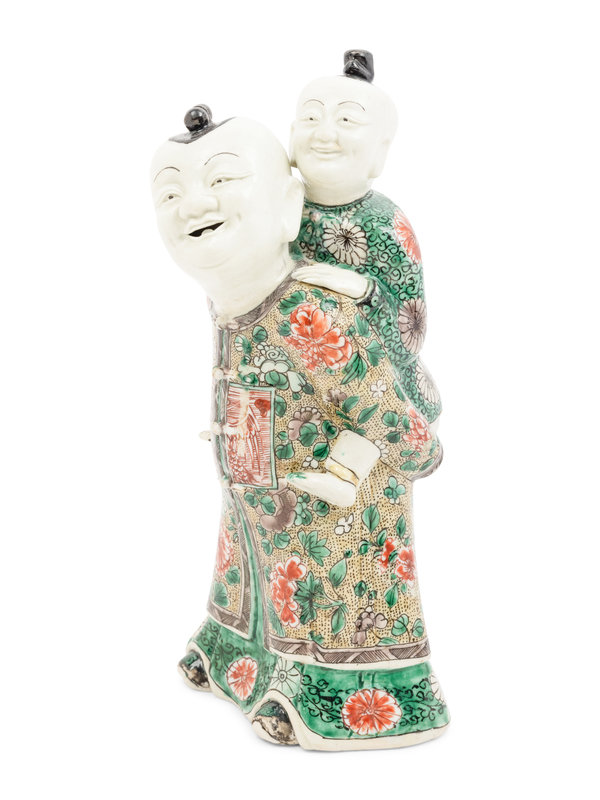 Modelled as a standing smiling young man wearing long yellow ground floral robes and the official badge of a firstgrade civil mandarin beneath three button tied clasps carrying a younger boy on his back who wears an aubergine ground flower head jacket